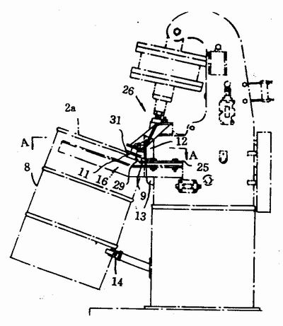 圖2是本發明的鋼桶桶口卷邊開卷裝置。圖中正在對一開口桶8的(de)桶口卷邊進行開卷。此時,蓋3和填充劑4是沒有的。鋼桶桶口卷邊2a朝上。圖2中所示的犁(lí)形開卷器9有一個鼻狀體10(見圖3)。它的伸出高度不超過鋼桶桶口卷邊2a。導向輥輪11與犁形開(kāi)卷器9相對府-對鋼桶桶口內壁進行擠壓。導向輥(gǔn)輪的外圍法蘭31超過鋼(gāng)桶桶口卷邊2a的上表麵。