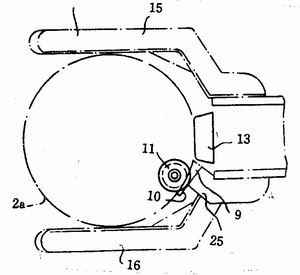 然(rán)後,輥輪12和(hé)13被同時驅動,拖動鋼桶桶口卷邊(biān)2a倚於犁形(xíng)開卷器的鼻狀物10上來展(zhǎn)開它。導向輥輪1也與輥輪12配合動作。輥(gǔn)輪12可采用(yòng)氣動或液壓來推動。