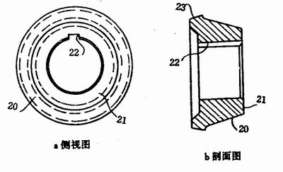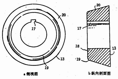 圖4說(shuō)明下輥輪13通過鍵槽被固定在(zài)驅動軸上。輥輪(lún)的外(wài)表麵20與它的前端麵18的垂線具有15°的夾角。輥輪的前(qián)端麵18與外緣轉(zhuǎn)角(jiǎo)處倒成圓角。