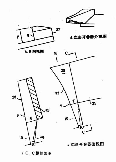 如圖(tú)6所(suǒ)示,犁形開卷器9固定在平板25上(shàng)(見圖1)。而此平板則通過螺栓固定在圖2所示的設備的機架上。犁形開卷器9的大致,外形受囤2和6d。它具有一個(gè)與鋼桶桶(tǒng)身外表曲麵相匹配的弧形內表麵,其曲率半(bàn)徑為28.6cm。從圖6a中也可看到它的(de)機體是斜削的,鼻狀物10的斜削始於平(píng)板25。實際上,在具體設(shè)備中,它的上表麵28與平板25呈4°夾(jiá)角。鼻狀(zhuàng)物10的下部外表麵29倒成圓角,當(dāng)它對鋼桶桶口(kǒu)卷邊進行開卷(juàn)動作時,與卷邊2a的端部30接觸。
